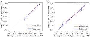 The nomogram map was validated internally and externally using the bootstrap method, and the number of self-sampling times was B =1,000. The validation results showed that the C-index of the training group was 0.85 [95% confidence interval (CI): 0.836, 0.863], while the C-index of the verification group was 0.833 (95% CI: 0.807, 0.858). A higher C-index indicates more accurate prognostic prediction (12). The correction lines of the 3- and 5-year survival rates of the modeling group and the verification group are shown in Figure 3. As Figure 3 shows, the correction curves of the modeling group and the verification group are close to the ideal 45° dotted line, indicating a good consistency between the predicted value and the actual value (13). A score for each of the clinical pathological features of a TPBC patient can be obtained by projecting the patient’s score upwards onto a small scale and summing the scores to obtain a total score, the higher the total score, the worse the survival prognosis, and the lower the OS rate at 3 and 5 years (14).