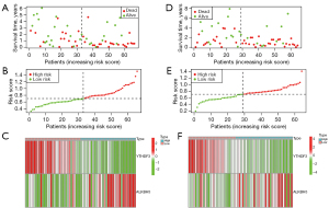 A total of 129 patients with AML were categorized into a training set (n=65) and a validation set (n=64) at a rough ratio of 1:1. Next, 2 m6A signatures (i.e., YTHDF3 and ALKBH5) were selected to build a prognostic model according to the LASSO regression analysis of the training set (see Figure 6A,6B). The patients were then divided into a high-risk score group and a low-risk score group based on the median risk scores. To further examine the stability and effectiveness of the established model, we used K-M plots to analyze both the training and validation sets and found that the low-risk score cohort had a better survival rate than the high-rick score cohort (both P<0.05; see Figure 6C,6D). The AUC of the training set reached 0.774, and that of the validation set was 0.665 (see Figure 6E,6F). These results suggest that the risk model can be used as an important indicator for evaluating the prognosis of AML, but it is not the only criterion, and we can increase the sample size and repeat the validation in future clinical data analysis. We also evaluated the relationship between the risk score subgroups, overall survival (OS), OS status, and the level of expression, and the 2 m6A signatures. We found that the expression of YTHDF3 in the training cohort was lower in the high-risk group and higher in the low-risk group, while the expression of ALKBH5 showed the opposite trend. The same conclusion was drawn in relation to YTHDF3 in the validation cohort, but the expression of ALKBH5 did not change significantly (see Figure 7).