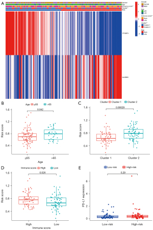 Clinical characteristics, such as age and sex, were examined in the subgroup analysis. From the univariate and multivariate Cox regression analyses, we found that age [hazard ratio (HR) 2.187 (1.155−4.142); P=0.016] and risk scores [HR 6.253 (1.097−35.634); P=0.039] were independent risk factors in the training cohort (see Figure 8A-8D). Notably, in relation to OS, the low-risk score group had a longer prognosis than the high-risk score group in AML patients aged ≤65 years and males or females (all P<0.05) (see Figure 8E-8H). The heatmap shows the expression of YTHDF3 and ALKBH5 in the different clinical subgroups of AML. YTHDF3 was more lowly expressed in the AML high-risk group, while ALKBH5 was more highly expressed in the AML high-risk group (see Figure 9A). Additionally, patients aged >65 years had a higher risk score than those aged ≤65 years (P=0.042; see Figure 9B). The results of the differential analysis revealed that Cluster 1 had a lower risk score than Cluster 2 (P=0.00029) (see Figure 9C). Notably, a higher immune score was associated with an increased risk score (P=0.026) (see Figure 9D). There was no statistically significant difference in PD-L1 between the low-risk and high-risk score groups (P=0.29; see Figure 9E).