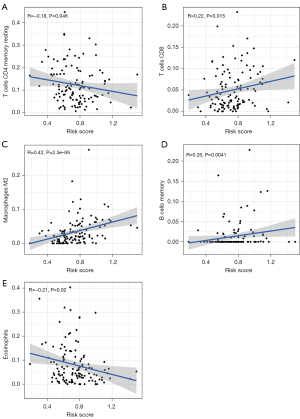 To further explore the relationship between the risk scores and immune cell infiltration, we conducted a correlation analysis, and found that the expression levels of the resting CD4 memory T cells (R=−0.18, P=0.046) and eosinophils (R=−0.21, P=0.02) were positively correlated to the risk scores, while the expression levels of the M2 macrophages (R=0.42, P=2.3e−06) and memory B cells (R=0.26, P=0.0041) were positively correlated to the risk scores (see Figure 10).