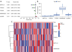 A total of 8 writer regulators (i.e., METTL3, METTL14, METTL16, WTAP, VIRMA, ZC3H13, RBM15, and RBM15B), 13 reader regulators [i.e., YTHDC1, YTHDC2, YTHDF1, YTHDF2, YTH M6A RNA binding protein 3 (YTHDF3), HNRNPC, FMR1, LRPPRC, HNRNPA2B1, IGFBP1, IGFBP2, IGFBP3, and RBMX], and 2 eraser regulators [i.e., FTO and alkB homolog 5 (ALKBH5)] were identified between the tumor samples and the normal samples. Additionally, a total of 5 m6A-related signatures were examined based on the univariate Cox regression analysis (applying the cutoff criteria of a P value <0.1), and their expression levels in AML were determined (see Figure 1). Higher expression levels of METTL14, YTHDC2, YTHDF, and HNRNPA2B1 were significantly correlated with better survival. Conversely, higher expression levels of ALKBH5 were significantly correlated with a worse prognosis (see Table 1).