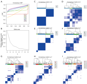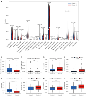 Figure 4A shows the results of the differential analysis in immune cell infiltration between the two clusters. These boxplots also show that the expression levels of memory-activated cluster of differentiation (CD)4 T cells, naive CD4 T cells, and eosinophils in Cluster 1 were higher than those in Cluster 2. Conversely, the expression levels of CD8 T cells and regulatory T cells in Cluster 1 were lower than those in Cluster 2 (see Figure 4B-4F). Additionally, the ESTIMATE score of Cluster 2 was higher than that of Cluster 1 (P<0.05; see Figure 4G) when grouped by stromal score and immune score, respectively, and differences were observed between Cluster 1 and Cluster 2 (see Figure 4H,4I).