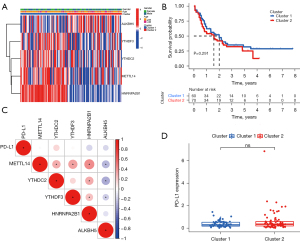 A consensus clustering analysis was performed on all AML patient samples using the combination of the identified probes. Following 1,000 clustering iterations at cluster counts (k) ranging from 2 to 8, k=2 was found to be the best k with the lowest proportion of ambiguous clustering (PAC) measures. This framework generated 2 distinct clusters, both with consensuses >0.99 (see Figure 2). A total of 129 specimens with AML were divided into Cluster 1 (n=59) and Cluster 2 (n=70). To further explore the relationship between the 5 m6A-related genes and clinical features, including age, sex, and cluster, we generated a heatmap showing the expression of these signatures (see Figure 3A). The K-M curve analysis showed that there was no significant difference between the 2 clusters (see Figure 3B). Additionally, as Figure 3C shows, the 5 m6A genes were correlated to each other. PD-L1 was positively correlated with YTHDC2, while PD-L1 was negatively correlated with HNRNPA2B1 and ALKBH5. The expression of PD-L1 was differentially increased in Cluster 2 compared to Cluster 1 (see Figure 3D).