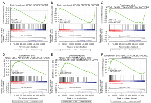 To clarify the underlying regulatory mechanism causing the difference between the 2 subtypes, we described the top pathways in the different clusters based on the GSEA. The outcome illustrated that spliceosome (NES =−1.85, normalized P=0.01), protein export (NES =−1.71, normalized P=0.02), and basal transcription (NES =−1.69, normalized P=0.025) factors were significantly correlated with Cluster 1 (see Figure 5A-5C). Additionally, Cluster 2 was enriched in cell adhesion molecules (CAMs) (NES =2.03, normalized P<0.001), arrhythmogenic right ventricular cardiomyopathy (ARVC) (NES =1.94, normalized P<0.001) and the notch signaling pathway (NES =1.91, normalized P<0.001) (see Figure 5D-5F).