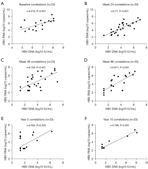We detected the levels of serum HBV DNA and HBV RNA at different time points and performed a correlation analysis. We found that HBV DNA and HBV RNA were always positively correlated over the 10-year observation period (see Figure 2). The data were compared at (A) the baseline, r=0.62 and P<0.001, (B) week 24, r=0.77 and P<0.001, (C) week 48, r=0.71 and P<0.001, (D) week 96, r=0.81 and P<0.001, (E) year 5, r=0.60 and P<0.01, and (F) year 10, r=0.77 and P<0.001.