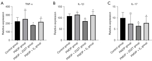 The inflammatory cytokines TNF-α, IL-17, and IL-1β can lead to osteoclast activation, which leads to local osteolysis. Moreover, inflammatory factors are closely related to the pain caused by osteoporosis, and the level of inflammatory factors can indirectly indicate the intensity of pain, thus their measurement may verify the analgesic effect of ZGZT. Serum levels of TNF-α, IL-17, and IL-1β were detected by ELISA. The expression levels of TNF-α and IL-1β in the PMOP group were higher than those in the Control group, while the expression levels of IL-17 in the PMOP group were lower than those in the Control group. The expression levels of TNF-α, IL-1β, and IL-17 in the PMOP + E2 group and the PMOP + ZGZT group were lower than those in the control group (Figure 5A-5C). The results showed that ZGZT could effectively inhibit the release of inflammatory factors and relieve pain.