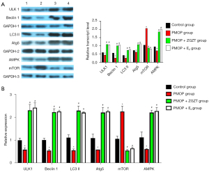 All of Atg-5, Beclin 1, LC3-II, and ULK1 are autophagy related factors. The mTOR can inhibit autophagy, AMPK can activate autophagy, and they jointly regulate autophagy. Increased autophagy of osteoblasts can reduce apoptosis and improve survival time. The expression levels of mTOR, AMPK, ATG-5, Beclin 1, LC3-II, and ULK1 in the L5 lumbar bone tissue of rats were detected by WB and qRT-PCR (Figure 6A,6B). In the PMOP group, mTOR expression level was high, AMPK level was low, and the related autophagy markers ATG-5, Beclin 1, LC3-II, and ULK1 expression levels were low. In the PMOP + ZGZT group and PMOP + E2 group, the mTOR level was lower, and the expression level of AMPK and related autophagy markers ATG-5, Beclin 1, LC3-II, and ULK1 was higher than in the PMOP group. Therefore, ZGZT can effectively activate the AMPK pathway, inhibit the mTOR pathway, and improve autophagy.