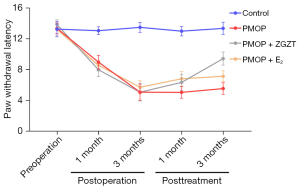 The mechanical pain threshold of PMOP rats was observed by Von Frey filaments method. As shown in Figure 1, the results showed that compared with the control group, the mechanical pain threshold of PMOP rats was significantly lower at the 1st and 3rd month after surgery (the last day of each month). Compared with the PMOP group, the mechanical pain threshold of PMOP + ZGZT group was partially alleviated at the 1st and 3rd month after treatment.