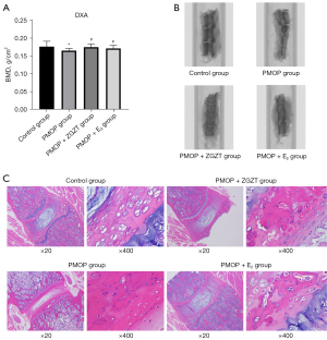 After modeling, dual energy X-ray absorptiometry (DXA; HLOGIC, USA) measuring bone mineral density (BMD). BMD of the lumbar spine (L1–L4) of PMOP rats was measured by DXA, and then the therapeutic effect of ZGZT on osteoporosis was evaluated.