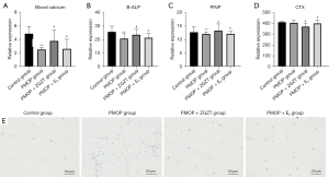 Low levels of calcium in the serum lead to insufficient calcium absorption and elevated B-ALP levels. The CTX levels reflect bone resorption levels and are significantly elevated in patients with osteoporosis. The PINP levels reflect the rate of type I collagen synthesis and osteogenic activity, and are elevated in patients with osteoporosis. Serum levels of calcium, B-ALP, PINP, and CTX were determined by ELISA. The results showed that the serum calcium content in the PMOP group was significantly decreased, the levels of B-ALP and PINP were significantly lower than those in the control group, while CTX level had no significant change. There were no significant differences in the levels of B-ALP, PINP, CTX in the PMOP + ZGZT group and PMOP + E2 group compared with those in the control group (Figure 4A-4D). The level of tartrate-resistant acid phosphatase (TRAP) was determined by TRAP staining, and the results showed that the TRAP level in the PMOP group was significantly higher than that in the control group (Figure 4E). This indicates that in the PMOP group, the bone formation level was decreased, while the bone absorption level was increased, and ZGZT can effectively restore bone metabolism.