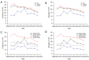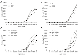 Overall, the age-specific incidence rates of EC were relatively low among individuals aged <44 years. An upward trend was revealed after 45 years, which peaked in the 80–84 age group. Similarly, an increasing trend was observed among individuals aged >45 years in both urban and rural areas. However, the incidence rates of EC decreased sharply after reaching its peak in the 80–84 years group in rural females and rural males. The age-specific mortality rates of EC were relatively low before age 44 years yet dramatically increased with age among individuals after age 45. Similarly, the trend was found in both urban and rural individuals and the mortality rates in all age groups in rural areas were higher than those in urban areas. However, the mortality rates in females in all age groups were lower than those in males in both urban and rural areas (Figure 2, Tables 4,5).
