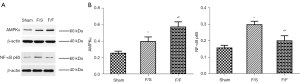 The supernatant was prepared as mentioned earlier. Levels of AMPKα and NF-κB p65 were determined by Western blot analysis. Extracts were boiled at 95 ℃ for 15 min in the presence of sample buffer. Identical amounts of protein samples were separated by 10% sodium dodecyl sulphate-polyacrylamide gel electrophoresis, and transferred to polyvinylidene difluoride membranes. Incubated the protein of interest and probe with the corresponding antibody overnight. After reaction with a secondary antibody, the target protein was visualized using an enhanced chemiluminescence reagent. Gray values of the Western blot were quantified using ImageJ software V3.0 from the National Institutes of Health (Bethesda, MD, USA).