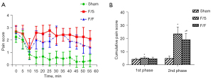 Injection of 5% formalin into the left hind paw produced biphasic flinching and licking of the injected paw, with the first phase lasting for 10 min and the second phase lasting 15–60 min (Figure 1A). There were no significant differences between the F/S and F/F groups in the first phase after comparing the cumulative pain score (one-way ANOVA, P>0.05) (Figure 1B). In the second phase, there were significant differences in cumulative pain scores among the rats in each group (one-way ANOVA, P<0.05) (Figure 1B). Pretreatment with flurbiprofen axetil significantly affected the second phase, but not the first phase, of flinching and licking, calculated based on the cumulative pain score.