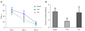 To evaluate the effect of flurbiprofen axetil on cognitive function, rats were trained and assessed using the MWM test; the latency of rats was shortened with prolonged training time. As shown in Figure 2A, the escape latency of the F/S group was longer than that of the other 2 groups (one-way ANOVA, P<0.05). The trend of the F/S group was different from that of the other 2 groups. After 5 days of training, the platform was removed from the water tank to assess spatial memory. As shown in Figure 2B, the number of times the rats crossed the platform in the F/S group was different from that in the other 2 groups (one-way ANOVA, P<0.05). These results suggested that formalin-induced inflammatory pain leads to impairments in cognitive function of rats with MCI, while pretreatment with flurbiprofen axetil restores these impairments.