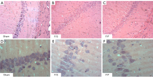 Six rats were randomly selected from each group, and the pericardium was opened to infuse the brain tissue with 10% neutral formaldehyde solution. The brains were immediately removed and then embedded in paraffin. The tissue was cut into 5-µm slices with a microtome. Sections were baked at 60 ℃ for 2 h, and disposed with dimethyl benzene for 20 min. Every section was dealt with ethanol, 95% ethanol, 80% ethanol, and distilled water in sequence. To investigate histological changes in brain tissue, hematoxylin-eosin (HE) staining was partially performed according to the conventional protocol