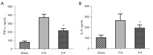 To assess the neuroinflammation induced by inflammatory pain, we analyzed levels of inflammatory cytokines, including TNF-α and IL-6, in hippocampal tissues. As shown in Figure 4, we discovered that the levels of TNF-α and IL-6 were significantly higher in the F/S group than in the sham group (one-way ANOVA, P<0.05), whereas they were decreased in the F/F group (one-way ANOVA, P<0.05).