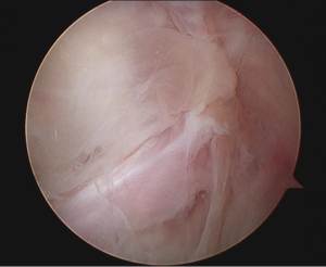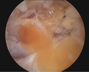 Arthroscopy revealed that the large ACL ganglion cyst was both intra-substance and extending in the posterior direction (Figures 2,3). A posteromedial portal was created to assist in visualising the ganglion from the back of the knee and to allow complete excision. The content consisted of a yellowish gelatinous material (Figure 4).