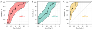 Three binary logistic models were established based on the significant dosimetric parameters in the univariate analysis of the ipsilateral, contralateral, and total lungs. The efficacies of these models were compared by ROC analysis. Figure 1 shows that the area under the curve (AUC) for the models of the ipsilateral, contralateral, and total lungs was 0.701, 0.661, and 0.920, respectively. Interestingly, the logistic model constructed by the total lung radiation dosage possessed superior classification performance. MLD [odds ratio (OR) =2.176, 95% CI: 1.306–3.625; P=0.003] and V35 (OR =1.635, 95% CI: 1.057–2.528; P=0.027) of the total lungs were found to be significant factors impacting RP occurrence (Table 2). The risk of RP of a grade greater than or equal to 2 could be predicted by the following formula: , where x = − 15.056 + 0.778 × MLD (Gy) + 0.492 × V35 (%).