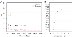 The discriminative performance of the RF model achieved the highest capacity at ntree =2,000 with an out-of-bag (OOB) value of 14.93% (Figure 2A). The variables affecting RP were ranked using the permutation feature importance method: MLD of total lungs (TMLD) [mean decrease gini (MDG): 5.74], TV20 (MDG: 4.62), TV35 (MDG: 3.08), TV5 (MDG: 2.04), TV25 (MDG: 1.36), GTV (MDG: 1.35), TV15 (MDG: 1.33), TV10 (MDG: 1.32), TV30 (MDG: 1.17), TV45 (MDG: 1.09), TV40 (MDG: 0.99), and TV50 (MDG: 0.84; Figure 2B).