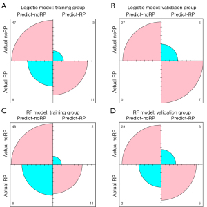Statistical analysis in this study was performed using R v. 4.1.3 (The R Foundation for Statistical Computing). The Pearson chi-squared or Fisher exact test was conducted to compare categorical variables between the 2 groups. Continuous variables are presented as mean ± standard deviation (normally distributed) or median (interquartile range; nonparametric). Continuous variables were analyzed with an independent t-test or a nonparametric test. Significant parameters identified during univariate analysis (P<0.05) were subjected to multivariate analysis. Both binary logistic regression and random forest (RF) models for the prediction of RP were established. The discriminative capacity of the prediction models was evaluated by comparing the receiver operating characteristic (ROC) or the confusion matrix results. All statistical tests were 2-tailed.