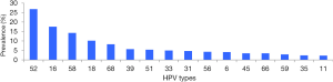 HPV detection and genotyping were performed using a MassARRAY platform (Sequenom, Sandiego, CA, USA), i.e., matrix-assisted laser desorption/ionization time-of flight mass spectrometer, as previously described (14,15). HPV DNA samples were extracted from the cervical specimens using a commercial magnetic beads kit (Chemagen, Pekinelmer, Waltham, MA, USA) in accordance with the manufacturer’s instructions, and amplified through polymerase chain reaction (PCR) technology. Sixteen HPV genotypes were successfully sequenced and identified, including 14 high-risk (HPV-16, -18, -31, -33, -35, -39, -45, -51, -52, -56, -58, -59, -66, and -68) and 2 low-risk (HPV-6, and -11) types. All DNA extraction, PCR amplification, HPV recombination plasmids, mass spectrum detection, and data analysis were performed by BGI in Shenzhen.