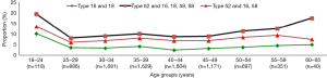 In total, we identified 16 genotypes of HPV. HPV-52 was the most common type identified in 6 of the 9 age groups, that is, all except the age groups 18–24, 35–39, and 60–65 years (Figure 2). Infections of combined HPV-52, HPV-16, and HPV-58 constituted 7.19% of all the cases, with no obvious association to any age group. Combined infection of HPV-16 and HPV-18 accounted for 3.40% of all cases, and no obvious association with an age group was observed. The combined HPV genotypes -52, -16, and -18, and HPV genotypes -58 and -68, were similarly prevalent in parallel as the most prevalent genotypes in the age 18–24 y group (19.48%) and in the age 60–65 y group (17.5%). Whereas HPV-16 was the most prevalent genotype in those aged 35–39 years.