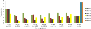 HPV-52, HPV-16, and HPV-18 were the three most prevalent types in subjects aged 18−34 years (Figure 3). HPV-52, HPV-16, HPV-58 were the three most prevalent types in the five age groups encompassing ages 35−59 years. Some genotypes of HPV were only detected in certain age groups.