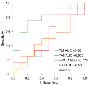 - Mei H, Jiang Y, Luo L, et al. Evaluation the combined diagnostic value of TAT, PIC, tPAIC, and sTM in disseminated intravascular coagulation: A multi-center prospective observational study. Thromb Res 2019;173:20-26. [Crossref] [PubMed]