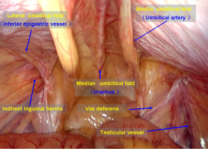 Laparoscopic inguinal hernia repair is performed more and more nowadays because of its mini-invasive nature and demonstrated good results. Laparoscopic procedures are especially suitable for recurrent and bilateral inguinal hernia (1,2). The major procedures include intraperitoneal onlay mesh (IPOM) repair, transabdominal preperitoneal (TAPP) repair and total extraperitoneal (TEP) repair. The anatomy of these procedures is totally different from traditional open procedures because they are performed from different direction. Laparoscopic operations for inguinal hernia are carried out intraperitoneally or in preperitoneal space. Surgeons must understand important anatomic acknowledge of the operation area under laparoscopic views before they begin to perform these procedures, otherwise it will be very risky to cause complications such as bleeding, nerve damage, insufficient repair and recurrence. The main anatomic points are discussed as followed.