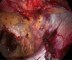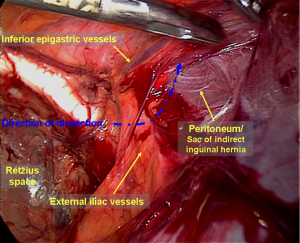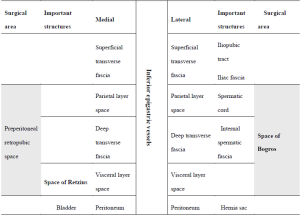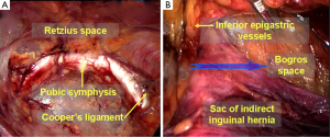 These two spaces are potential non-natural cavities under the lower anterior abdominal wall, and they lie in between the superficial transverse fascia and the peritoneum (Figure 6). They are created by blunt separation when performing a laparoscopic inguinal hernia repair.