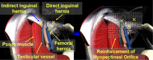 This anatomic region was originally coined by Dr. Fruchaud, a French researcher, in 1956. Direct inguinal hernias, oblique inguinal hernias and femoral hernias are all caused by weakness of the abdominal transverse fascia in myopectineal orifice (Figure 1). The inguinal ligament divides the myopectineal orifice into two regions: the suprainguinal region and the subinguinal region. The spermatic cord or the round ligament of the uterus runs through the suprainguinal region, while the femoral nerve, the femoral artery, the femoral vein and the femoral canal run through the subinguinal region. The deep layer of the myopectineal orifice is closed off by the abdominal transverse fascia, which surrounds the spermatic cord, and the femoral sheath, which passes through the myopectineal orifice. A single-side repair of the myopectineal orifice can simultaneously and completely repair the site of anatomical weakness for inguinal, direct and femoral hernias. This approach is also the principle of adult laparoscopic inguinal hernia repair (Figure 2).