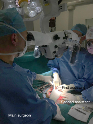 Interference from cardiac, aortic, and respiratory movements affects the stability of the small operative field and poses a significant challenge (23,57). Teamwork between the surgical and anaesthesiology teams is essential to maximize the stability. Before the suturing begins, the anaesthesiology team is informed to control the extent of respiratory movements by decreasing the respiratory rate and tidal volume to limit the superior-inferior movement of the surgical field (26,27). In some instances, the main surgeon may even ask that the anaesthesiologist stops respiration completely for a short duration while the needle is passed. This is important especially when placing critical sutures, such as those for haemostasis or at difficult angles and when fatigue is beginning to set in during times where multiple revisions of the anastomosis were deemed to be necessary.