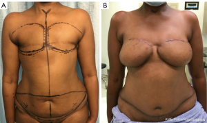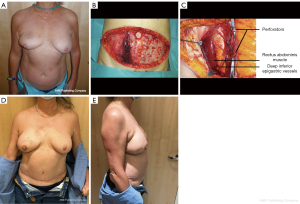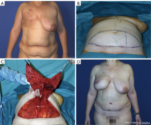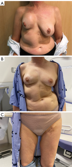 The use of autologous tissue for breast reconstruction exploded following Taylor’s research on angiosomes, microsurgery development, and, more recently, the standardization of fat grafting (9,10). There are numerous advantages to using autogenous solutions over implants: more natural feeling and texture, no implant surveillance, a better patient satisfaction rate and better resistance to radiation therapy (11). In addition, the tissue modeling can be specific for each patient’s anatomic features, such as the thorax width, the contralateral breast volume, or the desired volume in case of bilateral mastectomies and the overall appearance. However, donor site outcomes, surgery duration and safety concerns have emerged regarding the risk of cancer recurrences due to growth factors within the fat graft and the postoperative calcifications (12).