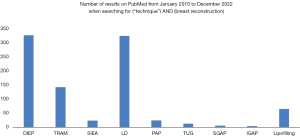 Faced with these many problems related to breast implants, autologous methods have emerged. Firstly, the pedicled TRAM flap with a transverse abdominal scar (93) was a very popular option. Then, the free version of the TRAM flap became the gold standard. Meanwhile, the popularity of the LD flap associated with an implant has been maintained from 1970s to nowadays. All of these techniques accumulate many problems: the abdominal weakening for the TRAM, the loss of function a large muscle for the LD. Moreover, the use of both LD flap and an implant concentrates the inconveniences of both autologous techniques including scarring and implants issues. A search of new donor sites with less morbidity was undergone. Since Taylor’s research on angiosomes, new donor sites have been described, using the abdomen, the back, the thighs and the buttocks. To put into perspectives the popularity of each autogenous techniques, the Figure 11 shows the number of publications referred in the PubMed database from January 2010 to December 2022. The DIEP flap and the LD flap appear to be the two dominant techniques. Because of its numerous advantages (Table 2), the DIEP flap is the gold standard to date without a doubt in autologous breast reconstruction.