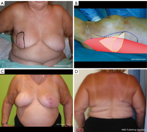 In our experience, candidates are considered for this flap when they are not admissible for DIEP reconstruction (previous abdominoplasty or liposuction, refusal of the patient to use the abdomen, insufficient abdominal skin or fat) (48). We believe that the LD flap should, as much as possible, be combined with autologous fat rather than using a breast implant. Indeed, doing the latter would cumulate the disadvantages of each technique: scars, potential shoulder pain or loss of function from LD flaps and rupture, capsular retraction, ALCL from breast implants. Several variations had been developed from that flap: muscle-sparing LD flap, thoracodorsal artery perforation (TDAP) flap and extended LD flap. The extended LD flap involves harvesting the fat tissue related to the muscle under the Scarpa fascia. This technique has the advantage of bringing more volume to the reconstruction, but it tends to give an asymmetrical aspect of the back in comparison with muscle-sparring LD flap (which consists of harvesting only of strip of muscle around the descending branch) (49,50).