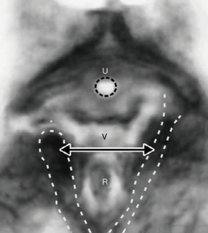 La vagina es el tubo de vaciado para el útero, el feto y la sangre menstrual. Una vagina tensa controla las señales de evacuación de la vejiga aferentes de los receptores de estiramiento urotelial "N" siendo estirados por el PCM y el LP para soportar "N" desde abajo (Figura 1). "N" es sensible a la presión hidrostática de la orina. La tensión vaginal debajo de "N" está regulada por husos musculares en el PCM y LP. La tensión debe ser suficiente para evitar que los nervios envíen impulsos de vaciado aferentes, pero lo suficientemente elástica para permitir el cierre separado de la uretra distal por el PCM y el cuello de la vejiga por el LP/LMA.