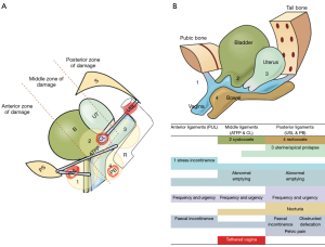 Los ligamentos dañados se dividen en tres zonas naturales (Figura 10). Anterior: desde el meato externo hasta el cuello de la vejiga; media: desde el cuello de la vejiga hasta el cuello uterino; posterior: desde el cuello uterino hasta el introito.