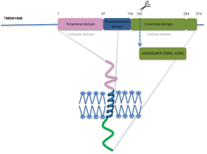 Jiang et al. [2022] extracted amyloid fibrils from the brains of four patients with FTLD-TDP, characterized by pathological neuronal inclusions with TDP-43. Using cryo-electron microscopy (cryo-EM), they observed that all amyloid fibrils were made up of a 135-residue carboxy-terminal fragment of TMEM106B, rather than TDP-43 (11). In fact, other studies observed that fragments derived from residues 120 to 254 in the C terminus of TMEM106B are a common feature in aging and besides several neurodegenerative disorders, such as Parkinson’s disease (12-14). Figure 1 shows the structure of TMEM106B with the N-terminal cytosolic, transmembrane, and C-terminal luminal domains. The luminal domain contains the aggregate fibril core (12,15).