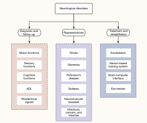 Neurological disorders are a group of heterogeneous diseases mostly characterized by motor and sensory dysfunctions. In severe cases, respiratory insufficiency, cardiovascular involvement, disorders of consciousness, or death may occur (6). The diagnosis relies on physical examination, patient-reported outcomes, tests on blood and cerebrospinal fluid, electrophysiological examination, neuroimaging, biopsy, genetic testing, etc. The contemporary landscapes of neurological disorders are shown in Figure 1.