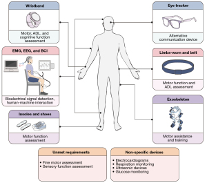 Clinical diagnosis and follow-up primarily assess motor functions, deep and superficial sensations, cognitive functions, and bio-electrical signals. A significant challenge is the limited accessibility of routine detection methods, which require professional equipment and personnel, posing difficulties for people with mobility limitations due to neurological disorders. Assessments may be influenced by examiner competence, examinees’ cognitive ability, and the empirical effects of repeated testing. Meanwhile, examinations in medical centers are time-consuming, with limited continuity and sensitivity to detect subtle changes. There is an urgent need for mobile, sustainable, and wearable devices to extend follow-up from the healthcare facilities to the community and home.