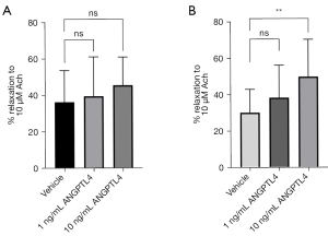 Endothelial function has been shown to be impaired in patients after MI (33) and is associated with a reduction in circulating nitric oxide (34). To further investigate the effects of ANGPTL4 on endothelial function, we next measured vasoreactivity of aortas ex vivo using intact and denuded vessel myography (35). As shown in Figure 4A, ANGPTL4 potentiated acetylcholine-induced relaxation in a dose-dependent manner, suggesting an endothelial-dependent mechanism. However, these effects were not statistically significant. As such, we tested the hypothesis that, like light pretreatment, an ANGPTL4 pretreatment would be necessary in order to observe significant changes. Indeed, 10 ng/mL ANGPTL4 pretreatment of aortas ex vivo resulted in a significant increase of acetylcholine-induced relaxation when compared to vehicle-treated controls (Figure 4B). Furthermore, removal of the endothelium completely abolished the responsiveness to both acetylcholine and ANGPTL4, suggesting an endothelial-dependent mechanism (data not shown). Together, these data demonstrate that ANGPTL4 improves vessel relaxation ex vivo.