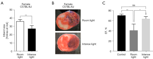 Next, we were curious if intense light therapy could also be beneficial following MI. Indeed, post-MI intense light treatment has never been investigated. Thus, we used a survival model for MI and repression injury in mice and determined the EF using echocardiography 5 days post-MI. A shown Figure 5C, our data show significantly improved myocardial function—as shown by the echocardiography Vevo770 (VisualSonics) system—in C57BL/6J mice that received intense light during one week of reperfusion following 45 minutes of MI. Based on these studies, we concluded that intense light protects female mice like male mice and that intense light therapy after MI improves the EF. Overall, intense pre- and post-treatment provides robust cardio protection in mice.