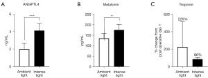 Finally, we analyzed troponin levels as marker of MINS. Using intense light therapy in the postoperative period in patients undergoing complex spine surgery, we found that patients treated with intense light demonstrated a decrease in their serum troponin levels of nearly 20% through post-operative day 2, whereas untreated patients demonstrated a 200% increase in serum troponin (Figure 6C). These data strongly suggest that intense light therapy may represent a possible novel strategy to reduce perioperative MINS and associated mortality. Together, we found that intense light therapy in patients undergoing non cardiac surgery increases ANGPTL4 and Melatonin plasma levels but decreases troponin levels.