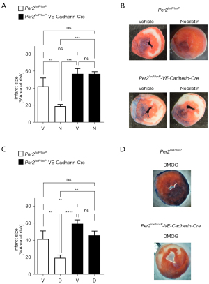 HIF1A and the circadian system are interconnected as HIF1A and the circadian core regulators are capable of direct binding to each other (29). While PER2 regulates the HIF1A response, HIF1A also controls the circadian machinery (30). As such hypoxia changes the core clock gene expression in a time- and tissue-dependent manner (31). How individual drugs, targeting one pathway, may lead to changes in the other pathway are unknown (30). While we found hypoxia-induced HIF1A transcription of the oxygen-efficient mitochondrial gene Cox4.2 to be abolished in a human microvascular endothelial PER2 knockdown cell line (8), administration of the HIF1A stabilizer dimethyloxalylglycine (DMOG) has never been investigated in Per2 deficiency. Accordingly, we treated Per2loxP/loxP or Per2loxP/loxP-VE-Cadherin-Cre mice with DMOG following 60 minutes of MI. As shown in Figure 1C,1D, we were able to demonstrate that DMOG-mediated cardioprotection was abolished in Per2loxP/loxP-VE-Cadherin-Cre mice. Together, these data demonstrate that DMOG-mediated cardioprotection requires endothelial-expressed PER2.