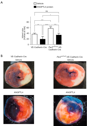 To understand intense light-elicited and PER2-dependent pathways, we recently conducted a genome-wide array, analyzing intense light-dependent gene expression before any ischemia even occurred. In silico analyses found dominant regulation of circadian pathways and identified the HIF1A-regulated angiopoietin-like 4 (ANGPTL4) as the top light and PER2-dependent gene. As ANGPTL4 was found to be downstream of PER2/HIF1A we hypothesized that ANGPTL4 treatment could overcome a Per2 deficiency in mice. In proof-of-concept studies, we treated Per2loxP/loxP or Per2loxP/loxP-VE-Cadherin-Cre with recombinant ANGPTL4 (10 microg/kg) during reperfusion. Indeed, as shown in Figure 2, recombinant ANGPTL4 restored a wild-type phenotype in Per2loxP/loxP-VE-Cadherin-Cre and provided robust cardioprotection in control mice. Together, these data demonstrate that ANGPTL4 mediates cardioprotection in wildtype and endothelial-specific-Per2-deficient mice.