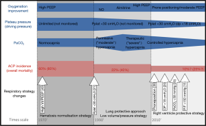 The PaO2/FiO2 ratio is routinely used to evaluate the severity of lung injury, while many confounding factors have been reported, as changes in cardiac output (27) and low PvO2 effect (28). A ratio below 150 mmHg is also associated with ACP (15). The effect of low oxygen levels on the pulmonary circulation has long been known. Enson et al. reported that the greater the oxygen unsaturation, the higher the mean pulmonary arterial pressure (29). And this is obviously true whatever the cause of such a decrease in oxygenation, i.e., severe lung injury or associated compromised hemodynamics. It is interesting to note that the only study on prone positioning (PP) that reported a significant increase in survival is the one which included patients with a PaO2/FiO2 ratio below 150 mmHg (30). In this study, PP very significantly increased survival as well as the number of days free from cardiovascular dysfunction, and decreased the number of cardiac arrests (30), suggesting that hemodynamics plays a major role in the effect of PP on survival. Indeed, PP is also well known to unload the RV (31,32) and we can reasonably assume that improvement in RV function during PP could be one of the main mechanisms explaining the amelioration of survival. PP has very few limitations and can also be proposed for obese patients (33) and after abdominal surgery (34).