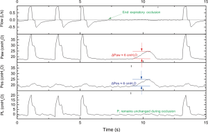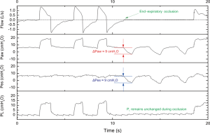 PL is calculated as the difference between the airway pressure and PES. When flow is absent, the role of resistive forces is ruled out and airway pressure is equilibrated with alveolar pressure, with PL corresponding to transalveolar pressure, provided that airways are fully open (25). Essentially, during end-inspiratory and end-expiratory occlusions, the difference between airway pressure and PES is the actual pressure the alveoli are exposed to.