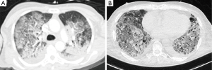 During the acute phase, within 48 h from onset, CXR could not show any pathological sign, after then a rapid worsening occurs, and diffuse bilateral opacities appear as ‘white lung’ image (Figure 1A); moreover, alveolar bronchograms and atelectasis are a frequent finding. In this phase, lung volumes are dramatically reduced and start posing a serious challenge for mechanical ventilation. For a specific radiologic diagnosis, the CXR should not show sign of heart failure such as heart shape enlargement, septal lines and pleural effusion: a comprehensive clinical evaluation is mandatory to perform an accurate differential diagnosis. In the intermediate or proliferative phase, occurring within 1–2 weeks from ARDS onset, the CXR aspect stabilizes presenting usual asymmetric consolidation and persistent diffuse infiltrates. At this stage, the lung tissue is prone to initiate a fibrotic degeneration process. The late or fibrotic phase is the most variable phase, influenced by intra- and inter-patient factors that can heavily affect the clinical outcome. In a widely variable interval of time, radiologic findings tend to improve, and the complete lung damage resolution depends on the severity of the ARDS, along with the patient’s response, underlying condition and comorbidities. The lung matrix is characterized by fibroblast proliferation as reaction to persistent inflammation, CXR may show a focal or a diffuse reticular pattern that usually corresponds to an increased physiological dead space. ARDS can resolve completely or progress to irreversible fibrosis: CXR will either show a restitutio ad integrum or a typical fibrotic pattern (Figure 1B).