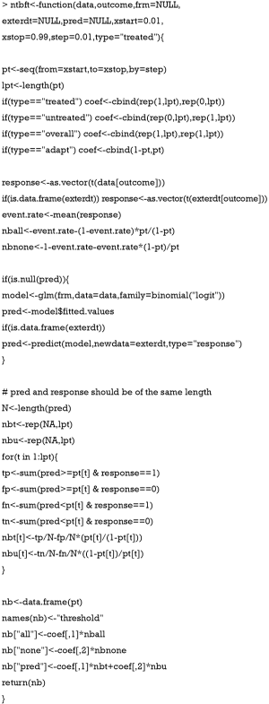 - type: controls the type of net benefit to be computed. The allowed values correspond to the treated (“treated”), untreated (“untreated”) and overall (“overall”) patients, or to the ADAPT index (“adapt”). The default is the “treated”.