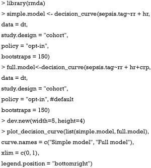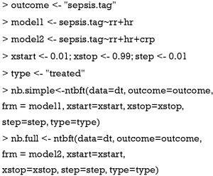 Sepsis can be predicted by simply using vital signs such as heart rate (hr) and respiratory rate (rr), which is cheap and easy to perform (simple model). Laboratory test such as crp is costly but can help to increase the predictive accuracy (full model). The net benefit for these two models can be calculated as follows (the starting point, the end point and the incremental step of the threshold probabilities, as well as the type of net benefit to be considered can be changed by the user if one wishes):